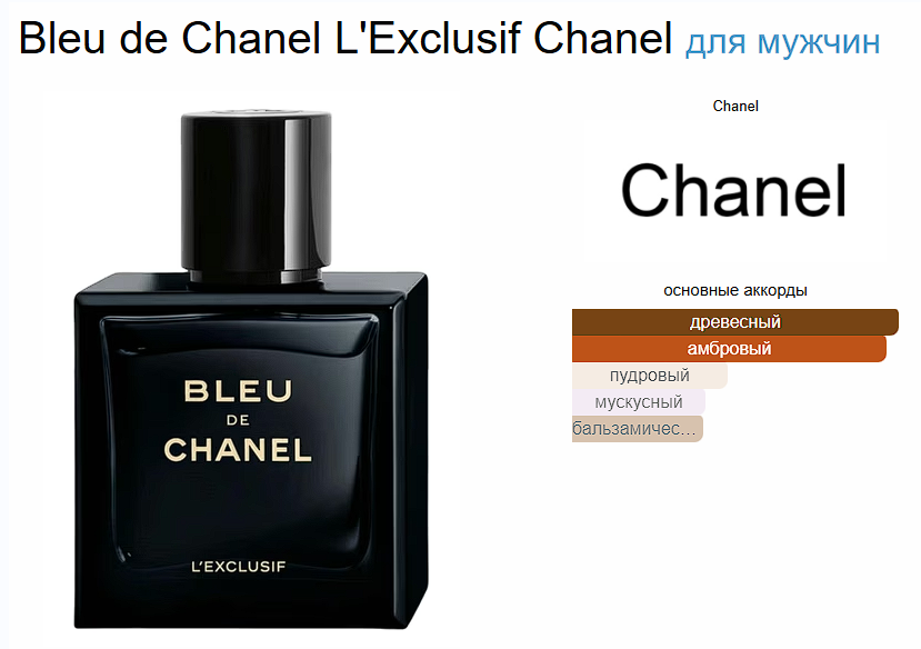 Bleu de Chanel L'Exclusif Chanel — это аромат для мужчин, он принадлежит к группе древесные фужерные. Это новое издание: Bleu de Chanel L'Exclusif выпущен в 2025 году. Парфюмер: Olivier Polge.
