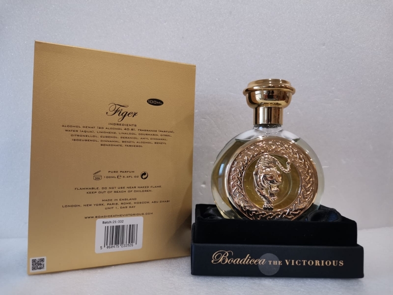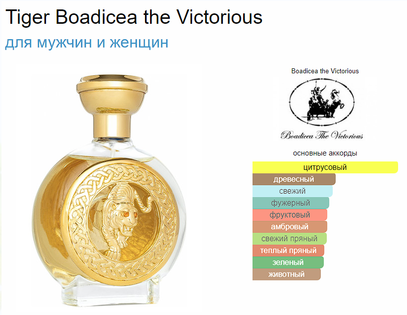 Tiger Boadicea the Victorious — это аромат для мужчин и женщин, он принадлежит к группе древесные пряные. Tiger выпущен в 2022 году. Парфюмер: Christian Provenzano. Верхние ноты: Грейпфрут, Мохито, Цитрусы, Черная смородина, Бергамот и Имбирь; средние ноты: Магнолия, Перец и Жасмин; базовые ноты: Серая амбра, Ветивер, Мускус, Сандал и Пачули.