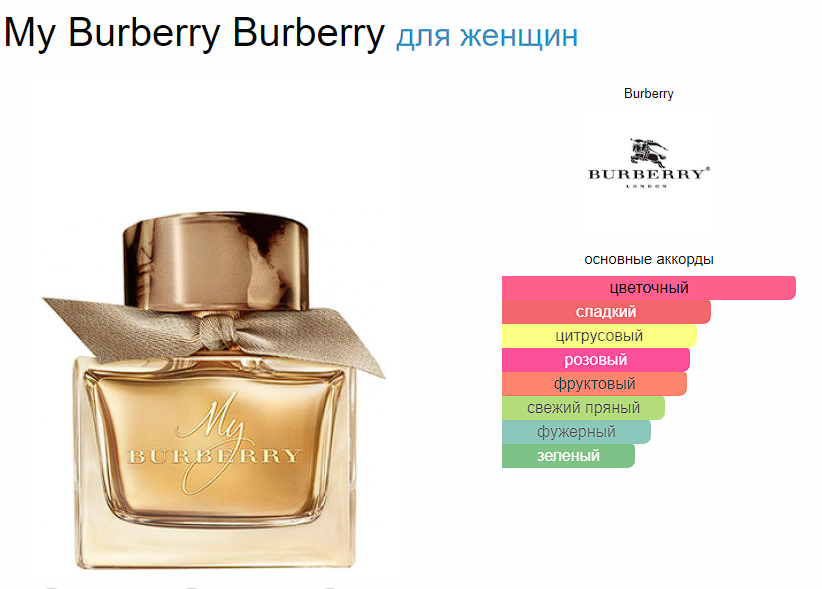 Композиция аромата My Burberry раскрывается звучанием нот освежающего бергамота и душистого горошка, переплетаясь с нотами листьев герани, очаровательных цветов фрезии и золотистой айвы в сердце. Аккордами соблазнительного пачули, дамасской и столепестковой розами завершается данная женственная композиция.