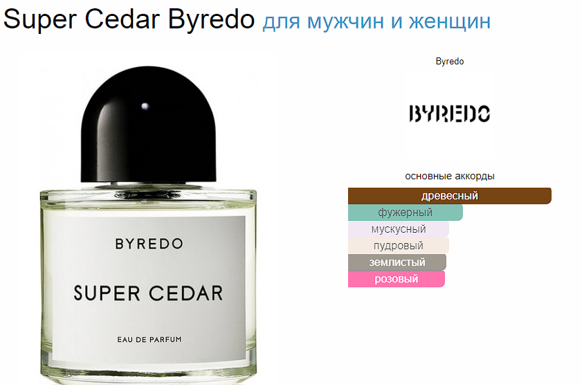 Создавая аромат Super Cedar, парфюмер Джером Эпинет представлял огромные кедры, росшие вокруг домов из срубленных тут же деревьев. Воспоминания детства стали источником вдохновения и причиной появления на свет в 2016 году яркого, унисексового аромата под брендом Byredo. Вместе с неординарным характером древесина кедра подарила композиции естественную гармоничность и теплоту. Ноты древесины кедра из Виржинии переплетаются со сладостной мелодией красной розы, землистым, щекочущим ноздри ветивером и чувственным мускусом. Умеренная цветочно-фруктовая сладость, благородная простота древесины и деликатный мускусный, травянистый фон – выбор человека, считающего свежий ветер родного края самым пьянящим из напитков. * Объем 100мл * Пол Унисекс * Тип EDP * Вес 400 * Год выпуска 2016