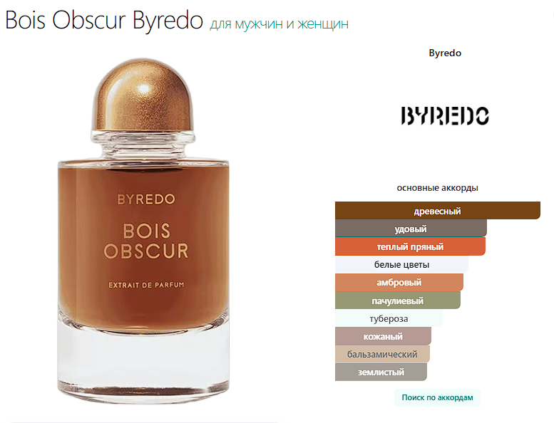 Bois Obscur Byredo — это аромат для мужчин и женщин, он принадлежит к группе восточные древесные. Это новое издание: Bois Obscur выпущен в 2025 году. Верхние ноты: Шафран, Эвкалипт и Папирус; средние ноты: Уд, Тубероза и Жасмин; базовые ноты: Пачули, Лабданум, Амбра и Сандал.