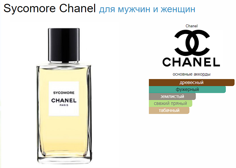 Les Exclusifs de Chanel Sycomore («Эксклюзив от Шанель Сикомор») – древесный парфюм, покоряющий сердца с первых же нот. Именно такой аромат создала Шанель в 1930 году. А в 2007 году этот парфюм был воспроизведен в обновленной интерпретации парфюмером Жаком Польж, который создавал остальные духи для линейки Les Exclusifs de Chanel. Sycomore – большое дерево с вкусными, съедобными плодами. Главной нотой дополняющий этот запах является ветивер, украшенный ореолом пряностей, можжевельника, очаровывает своей утонченностью и оставляет мягкий, теплый шлейф. Ветивер раскрывает всю чувственность и женственность. Парфюм Sycomore немного напоминает мужской из-за смелости и глубины древесного звучания. Парфюмерная композиция состоит из нот нероли, бергамота, розы, жасмина, иланг-иланга а также кедра, сандала, мускуса и табака
