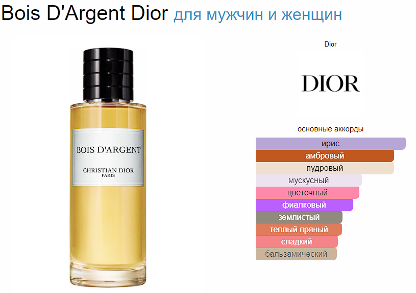 The Collection Couturier Bois D`argent («Коллекция кутюрье. Серебреная древесина») - аромат для мужчин и женщин от известного французского дома моды Christian Dior . Парфюмерная композиция The Collection Couturier Bois D`argent от Christian Dior была создана в 2004 году и вошла в группу ароматов древесные шипровые. Автор букета - парфюмер Annick Menardo.