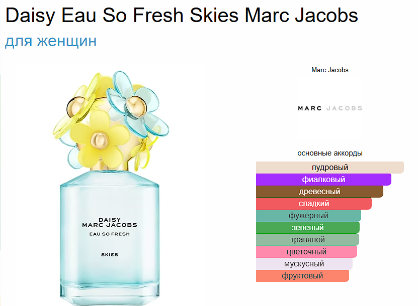 Daisy Eau So Fresh Skies Marc Jacobs — это аромат для женщин, он принадлежит к группе . Daisy Eau So Fresh Skies выпущен в 2021 году. Парфюмер: Alberto Morillas. Верхние ноты: Чай, Крыжовник и Грейпфрут; средние ноты: Фиалка, Ромашка и Дрок; базовые ноты: Кедр, Мускус и Масло чайного дерева.
