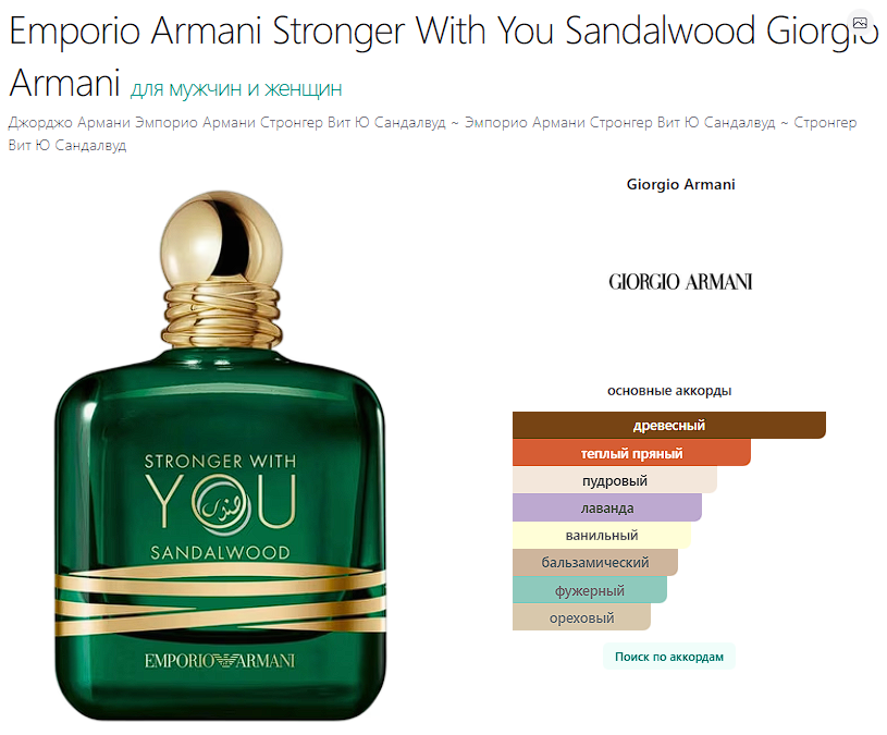 Emporio Armani Stronger With You Sandalwood Giorgio Armani — это аромат для мужчин и женщин, он принадлежит к группе восточные древесные. Это новое издание: Emporio Armani Stronger With You Sandalwood выпущен в 2025 году. Верхняя нота: Шафран; средние ноты: Лаванда и Каштан; базовые ноты: Сандал, Кедр и Ваниль.