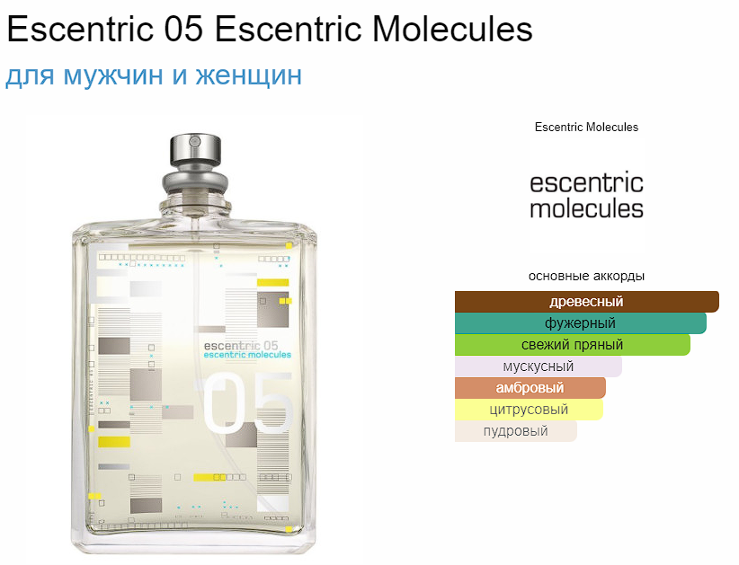 Escentric 05 — фирменная туалетная вода с древесным ароматом для женщин и мужчин, создання в 2020 году немецким парфюмерным брендом Escentric Molecules. Неординарный и эксцентричный аромат является продолжением инновационной парфюмерной коллекции бренда, парфюмер которой Geza Schoen «хотел воссоздать свои ощущения от Средиземноморья, когда вокруг тропинки, идущей на пляж, стоят роскошные деревья, сухие смолистые и от этого необычайно ароматные…». Чудесные свежие цитрусовые оттенки апельсина и бергамота, зеленые прохладные травянистые акценты листьев инжира и сладость аромата плодов открывают аромат, который наполняется в средних нотах пирамидки композиции пряно-хвойным запахом розмарина и можжевельника, пряными акцентами древесины лавра и кипариса. Экзотичный обволакивающий шлейф аромата создан на основе сочетания элегантных нот древесины кашмерана, мастикового дерева и чудесного насыщенного сладковато-бальзамического запаха лабданума.