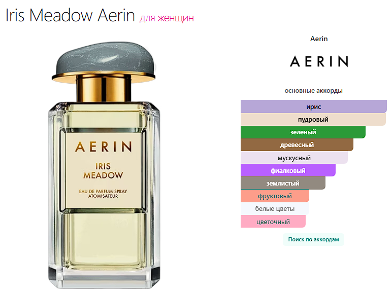 Iris Meadow Aerin — это аромат для женщин, он принадлежит к группе цветочные древесно-мускусные. Iris Meadow выпущен в 2014 году. Верхние ноты: Зеленые ноты и Черная смородина; средние ноты: Ирис и Жасмин; базовые ноты: Мускус и Кедр.