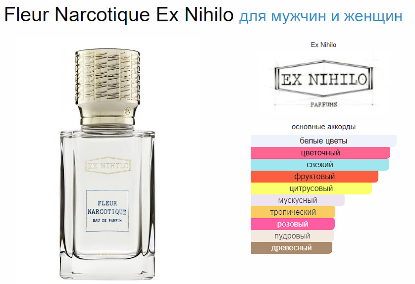Fleur Narcotique Ex Nihilo — это аромат для мужчин и женщин, он принадлежит к группе цветочные фруктовые. Fleur Narcotique выпущен в 2014 году. Парфюмер: Givaudan. Верхние ноты: Бергамот, Личи и Персик; средние ноты: Жасмин, Пион и Апельсиновый цвет; базовые ноты: Древесные ноты, Мох и Мускус. * Объем 100мл * Пол Унисекс * Тип EDP * Вес 400