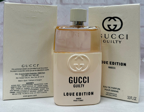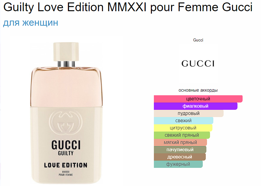 Guilty Love Edition MMXXI pour Femme Gucci — это аромат для женщин, он принадлежит к группе восточные цветочные. Guilty Love Edition MMXXI pour Femme выпущен в 2021 году. Парфюмер: Alberto Morillas. Верхние ноты: Розовый перец, Мандор и Бергамот; средние ноты: Фиалка, Сирень и Герань; базовые ноты: Пачули и Амбра.