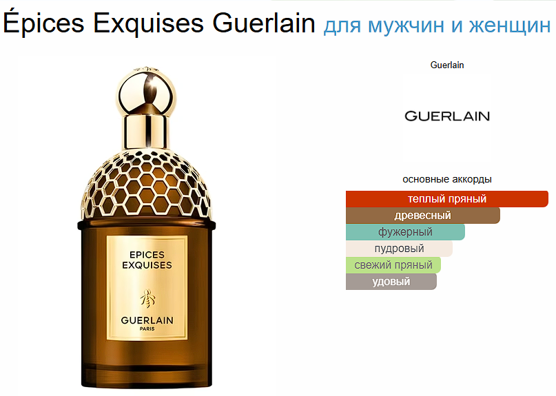 Épices Exquises Guerlain — это аромат для мужчин и женщин, он принадлежит к группе восточные пряные. Это новое издание: Épices Exquises выпущен в 2024 году. Парфюмер: Thierry Wasser. Верхние ноты: Кардамон и Розовый перец; средняя нота: Черный перец; базовые ноты: Сандал, Уд и Пачули.