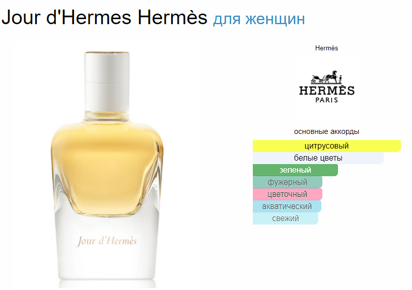 Jour d'Hermes Hermès — это аромат для женщин, он принадлежит к группе цветочные. Jour d'Hermes выпущен в 2013 году. Парфюмер: Jean-Claude Ellena. Верхние ноты: Грейпфрут, Лимон и Водные ноты; средние ноты: Белые цветы, Гардения, Зеленые ноты и Сладкий горошек; базовые ноты: Мускус и Древесные ноты.