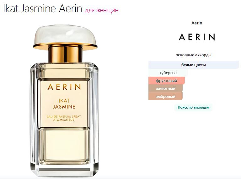 Ikat Jasmine Aerin — это аромат для женщин, он принадлежит к группе цветочные. Ikat Jasmine выпущен в 2013 году. Парфюмер: dsm-firmenich. Композиция аромата включает ноты: Жасмин, Египетский жасмин, Жимолость, Тубероза, Ambroxan и Сандал.