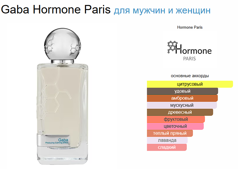 В верхнем аккорде парфюм дарит цитрусовую свежесть мандарина и апельсина с вплетенными нотами душистой лаванды. Затем на передний план выходит букет цветочных нот жасмина самбака и османтуса. Тогда как финальный аккорд парфюма Hormone Paris This Is Not Gaba окутывает мягкой пеленой бархатистого мускуса