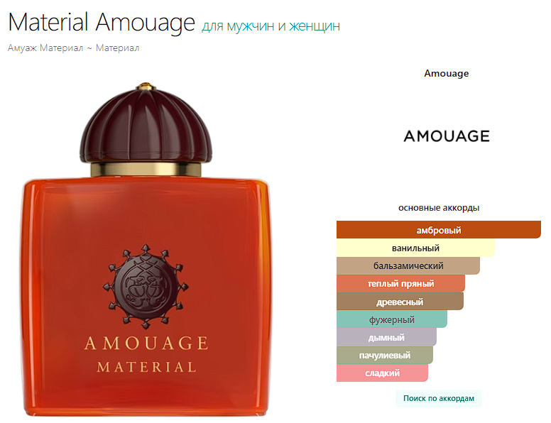 Material Amouage — это аромат для мужчин и женщин, он принадлежит к группе восточные гурманские. Material выпущен в 2021 году. Парфюмер: Cécile Zarokian. Верхние ноты: Элеми и Пачули; средние ноты: Мадагаскарская ваниль и Бензоин; базовые ноты: Бобы тонка, Ладан, Лабданум, Гваяк, Уд и Османтус.