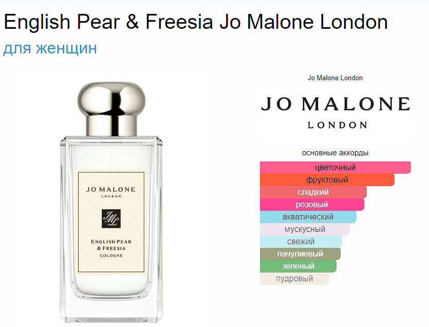 English Pear & Freesia Jo Malone - это аромат для женщин, принадлежит к группе ароматов шипровые фруктовые. English Pear & Freesia выпущен в 2010. Парфюмер: Christine Nagel. Верхние ноты: Дыня и Груша; ноты сердца: Белая фрезия и Роза; ноты базы: Мускус, Пачули, Амбра и Ревень. * Объем 100мл * Пол Женские * Тип Одеколон * Вес 400 * Год выпуска 2010