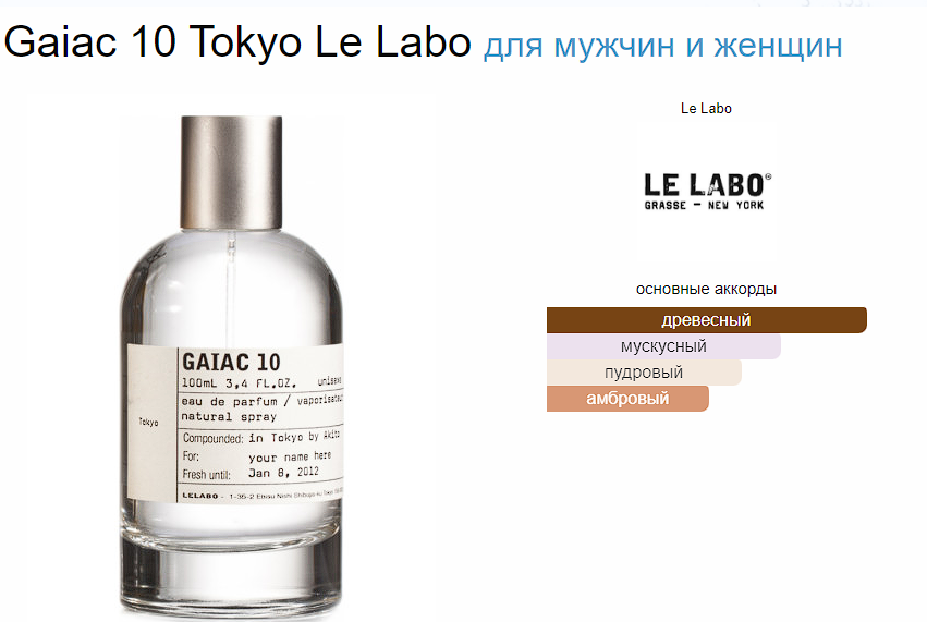 Gaiac 10 Tokyo Le Labo — это аромат для мужчин и женщин, он принадлежит к группе древесные. Gaiac 10 Tokyo выпущен в 2008 году. Парфюмер: Annick Menardo. Композиция аромата включает ноты: Гваяк, Мускус, Кедр и Олибанум.