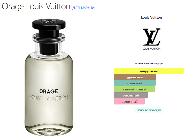 Orage Louis Vuitton — это аромат для мужчин, он принадлежит к группе древесные. Orage выпущен в 2018 году. Парфюмер: Jacques Cavallier Belletrud. Верхние ноты: Бергамот и Грейпфрут; средние ноты: Гедион, Ирис и Перец; базовые ноты: Масло яванского ветивера, Пачули, Iso E Super и Белый мускус.
