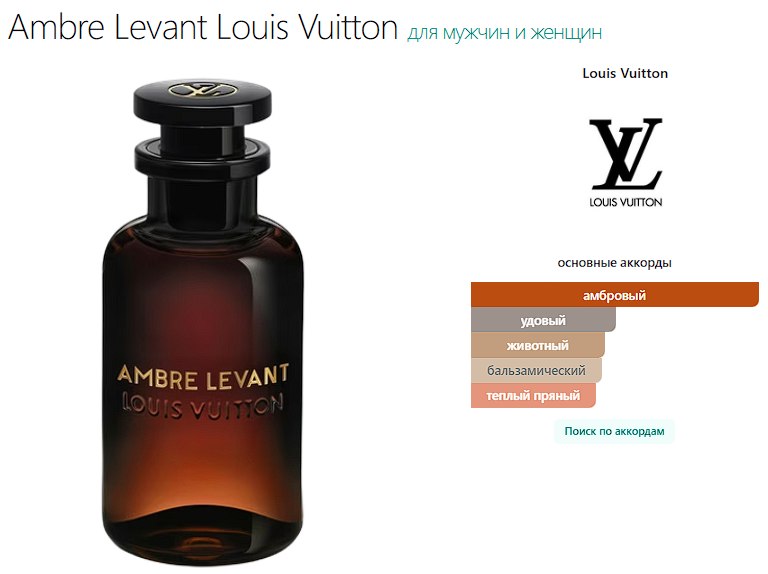 Ambre Levant Louis Vuitton — это аромат для мужчин и женщин, он принадлежит к группе восточные древесные. Это новое издание: Ambre Levant выпущен в 2026 году. Парфюмер: Jacques Cavallier Belletrud. Верхние ноты: Корица и Мандарин; средние ноты: Ладан и Белый перец; базовые ноты: Амбра, Серая амбра, Уд и Лабданум.