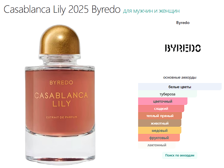 Casablanca Lily 2025 Byredo — это аромат для мужчин и женщин, он принадлежит к группе цветочные. Это новое издание: Casablanca Lily 2025 выпущен в 2025 году. Верхние ноты: Гардения и Слива; средние ноты: Индийская тубероза и Гвоздика (цветок); базовые ноты: Мед и Палисандр.
