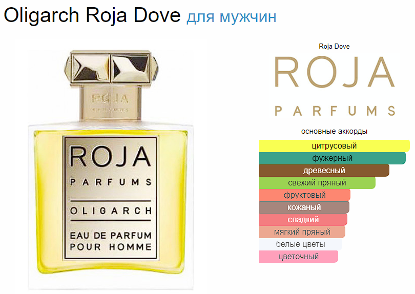 Oligarch – глубокий, многогранный и харизматичный мужской шипровый парфюм, окутанный роскошной ароматической мантией. Аромат выпущен в 2016 году известным британским домом элитной парфюмерии Roja Dove и посвящен самым успешным деловым мужчинам нашего времени, которых принято называть олигархами. Именно образ такого мужчины стремится передать своим звучанием аромат с названием «Олигарх». Звучание парфюма начинается с ароматов душистой лаванды и пряного чабреца, звучащих на фоне яркого, освежающего дыхания цитрусовых нот лайма и лимона. Сердце парфюма наполняют яркие цветочные ноты ванильно-лимонной чампаки, терпковатого жасмина, медового апельсинового цвета и пряного аромата лилии. Яркие и манящие ароматы спелого сочного яблока, ягод черной смородины и орехово-сливочные полутона кокоса придают сердечному аккорду особенно яркое, праздничное звучание. Но все это служит лишь преддверием роскошной, многогранной базе парфюма, которая смешивает в себе многоголосие пряностей, древесных и цветочных нот, создавая удивительное по красоте долгое ароматическое послевкусие.