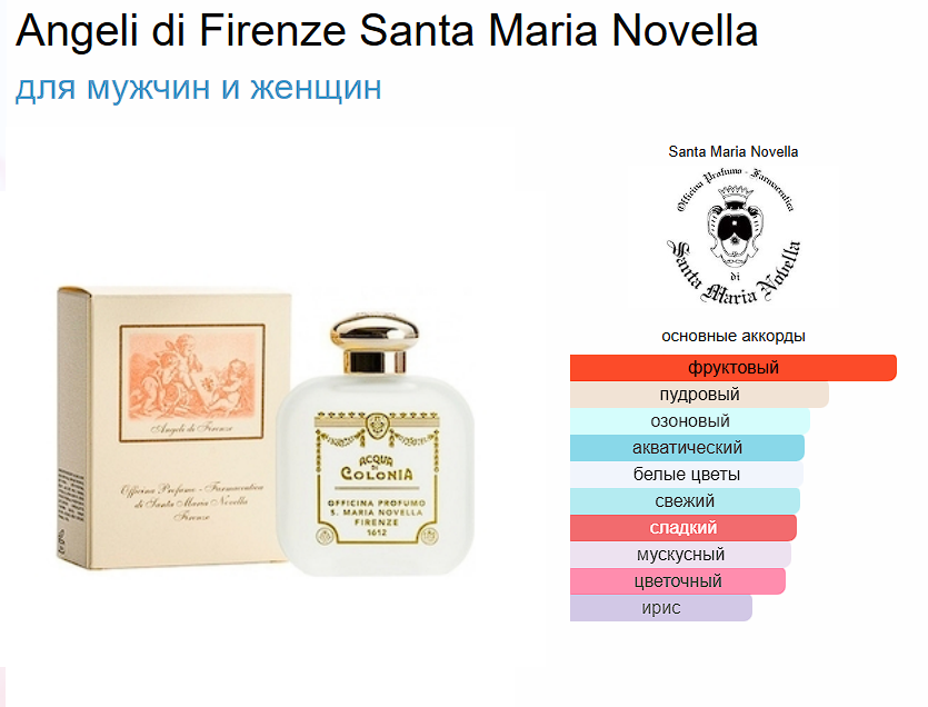 Angels of Florence Santa Maria Novella — это аромат для женщин, он принадлежит к группе цветочные. Angels of Florence выпущен в 2006 году. Верхние ноты: Гардения, Лайм, Африканский апельсиновый цвет, Герань, Жасмин, Сирень, Роза, Цикламен и Иланг-иланг; средние ноты: Дыня, Лист фиалки, Персик, Лист черной смородины и Слива; базовые ноты: Ветивер, Мускус, Ваниль и Сандал.