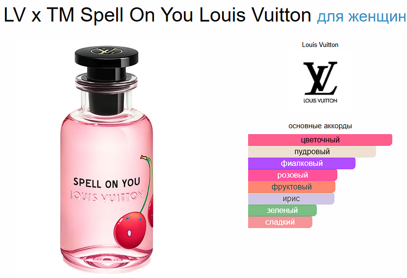 LV x TM Spell On You Louis Vuitton — это аромат для женщин, он принадлежит к группе цветочные. Это новое издание: LV x TM Spell On You выпущен в 2025 году. Парфюмер: Jacques Cavallier Belletrud. Верхние ноты: Тосканский ирис, Фиалка и Зеленые ноты; средние ноты: Роза, Тосканский ирис и Китайский жасмин; базовые ноты: Акация, Персик и Белый мускус.