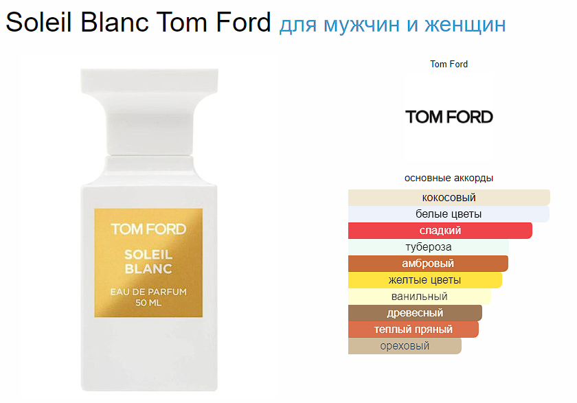 Eau de Soleil Blanc Tom Ford — это аромат для мужчин и женщин, он принадлежит к группе восточные цветочные. Это новое издание: Eau de Soleil Blanc выпущен в 2018 году. Верхние ноты: Горький апельсин, Бергамот, Петитгрейн, Тмин, Розовый перец, Фисташки, Кардамон, Цитрон и Нероли; средние ноты: Тунисский апельсиновый цвет, Жасмин, Тубероза, Иланг-иланг и Гальбанум; базовые ноты: Кокос, Амбра, Ваниль, Бобы тонка и Бензоин. * Объем 100мл * Пол Унисекс * Тип EDP * Вес 400