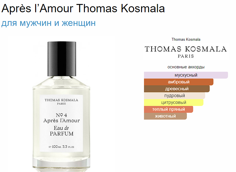 Après l’Amour Thomas Kosmala — это аромат для мужчин и женщин, он принадлежит к группе древесные фужерные. Après l’Amour выпущен в 2018 году. Парфюмер: Thomas Kosmala. Верхние ноты: Цедра лимона и Цветок горького апельсина; средняя нота: Ароматные специи; базовые ноты: Мускус, Амбра и Древесные ноты.
