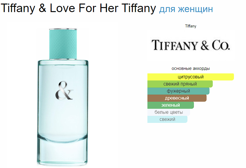 Love For Her — волнующий и утонченный женский цветочно-цитрусовый аромат, выпущенный в 2019 году знаменитым американским ювелирным домом Tiffany & Co. Аромат является частью парфюмерного дуэта для нее и для него. Парфюмы выпущены в лаконичных голубых стеклянных флаконах с обтянутыми мягкой кожей крышечками. Их лично разработал креативный директор компании Рид Кракофф. Оба аромата содержат уникальную по красоте звучания ноту голубой секвои, придающей парфюмам особую красоту звучания, сравнимую с роскошью выпускаемых брендом ювелирных изделий. Женская версия парфюма начинает звучание с игристой свежести цитрусовых нот розового грейпфрута и пряно-травяного запаха базилика. В сердце композиции царит пьянящий пряно-медовый аромат нероли. А завершает композицию хвойно-дымный запах кедра, пряно-смолистые оттенки голубой секвои и мягкие влажно-древесные нюансы ветивера, сплетающиеся в мягкий, струящийся ароматический шлейф.