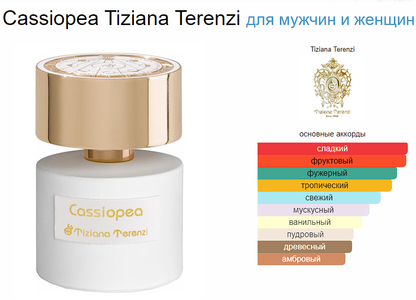 Cassiopea Tiziana Terenzi — это аромат для мужчин и женщин, он принадлежит к группе шипровые цветочные. Cassiopea выпущен в 2015 году. Парфюмер: Paolo Terenzi. Верхние ноты: Маракуйя, Лист черной смородины, Лимон и Папоротник; средние ноты: Чайная роза, Ландыш и Гвоздика (цветок); базовые ноты: Бобы тонка, Мускус и Сандал.