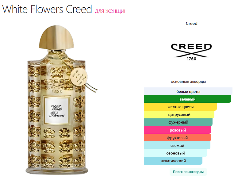 White Flowers Creed — это аромат для женщин, он принадлежит к группе цветочные зеленые. White Flowers выпущен в 2011 году. Парфюмер: Olivier Creed. Верхние ноты: Зеленое яблоко, Лимон и Лист фиалки; средние ноты: Итальянский жасмин, Марокканский жасмин, Болгарская роза и Герань; базовые ноты: Нарцисс, Мускус и Сандал.