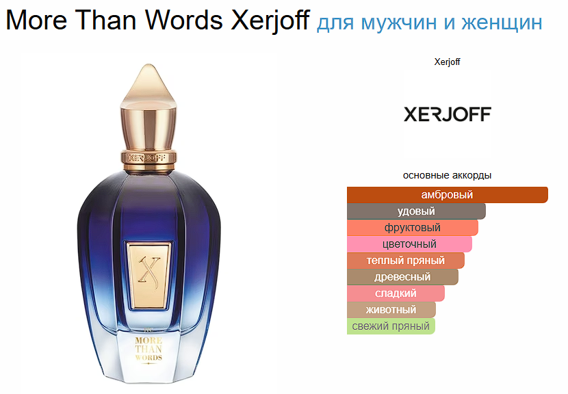 More Than Words Xerjoff — это аромат для мужчин и женщин, он принадлежит к группе восточные древесные. More Than Words выпущен в 2012 году. Парфюмер: Chris Maurice.