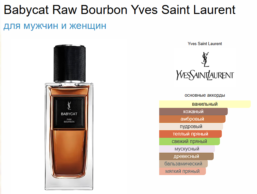 Babycat Raw Bourbon Yves Saint Laurent — это аромат для мужчин и женщин, он принадлежит к группе восточные древесные. Это новое издание: Babycat Raw Bourbon выпущен в 2025 году. Верхние ноты: Черный перец и Розовый перец; средние ноты: Шафран, Олибанум и Cмолы; базовые ноты: Ваниль, Замша и Кедр.