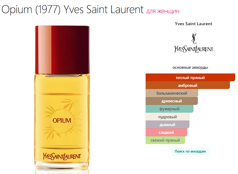 Opium (1977) Yves Saint Laurent — это аромат для женщин, он принадлежит к группе восточные пряные. Opium (1977) выпущен в 1977 году. Opium (1977) был создан Jean Amic, Jean-Louis Sieuzac и Raymond Chaillan. Верхние ноты: Гвоздика (пряность), Перец, Кориандр, Бей, Слива, Жасмин, Мандарин, Бергамот и Цитрусы; средние ноты: Гвоздика (цветок), Корица, Сандал, Пачули, Корень ириса, Роза, Персик и Ландыш; базовые ноты: Ладан, Мирра, Сандал, Толу бальзам, Амбра, Опопонакс, Бензоин, Лабданум, Ваниль, Мускус, Кастореум, Кедр, Ветивер и Кокос.