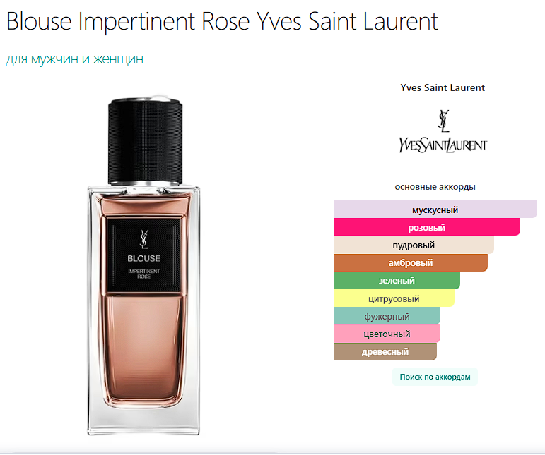 Blouse Impertinent Rose Yves Saint Laurent — это аромат для мужчин и женщин, он принадлежит к группе . Это новое издание: Blouse Impertinent Rose выпущен в 2025 году. Парфюмер: Quentin Bisch. Верхние ноты: Гальбанум, Бергамот и Розовый перец; средние ноты: Роза и Ангелика; базовые ноты: Кашмеран и Мускус.