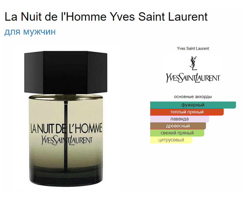 La Nuit de l'Homme Yves Saint Laurent — это аромат для мужчин, он принадлежит к группе древесные пряные. La Nuit de l'Homme выпущен в 2009 году. La Nuit de l'Homme был создан Anne Flipo, Pierre Wargnye и Dominique Ropion. Верхняя нота: Кардамон; средние ноты: Лаванда, Вирджинский кедр и Бергамот; базовые ноты: Ветивер и Тмин.